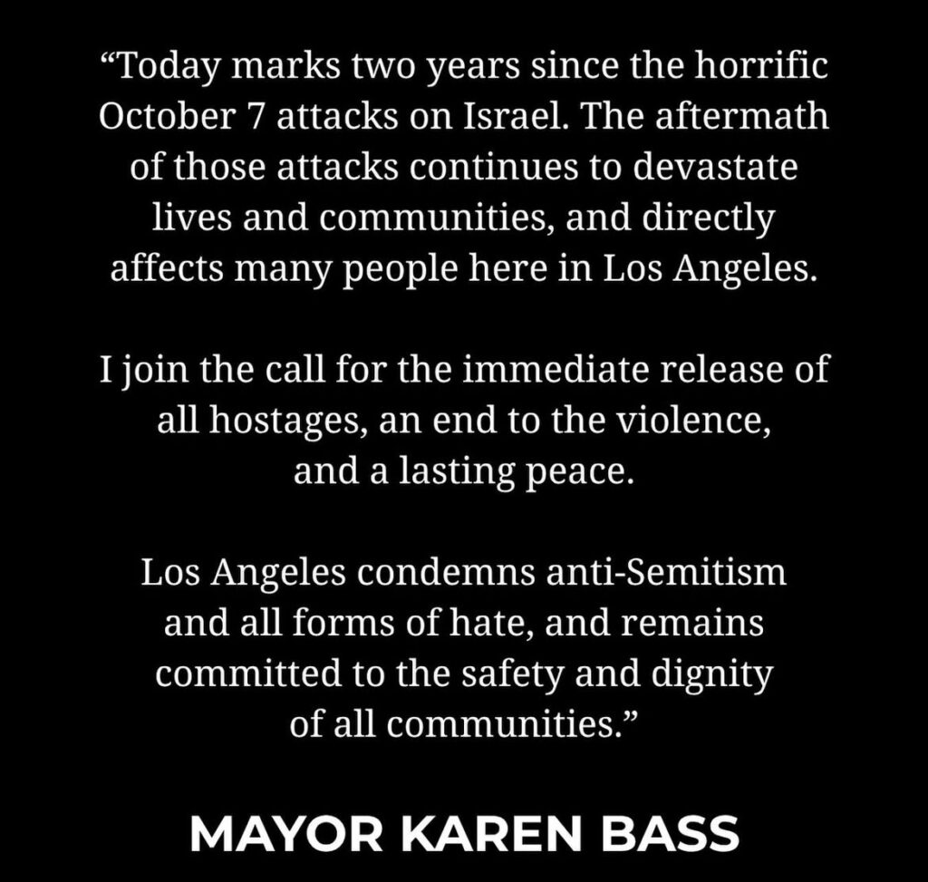 그는 “우리는 잃어버린 1,200명의 무고한 생명을 기억하며, 극도의 조건에서 아직도 인질로 잡혀있는 이들의 무사 귀환을 기도한다. 우리는 로스앤젤레스 공동체에서 힘을 찾고 있다”고 덧붙였다.