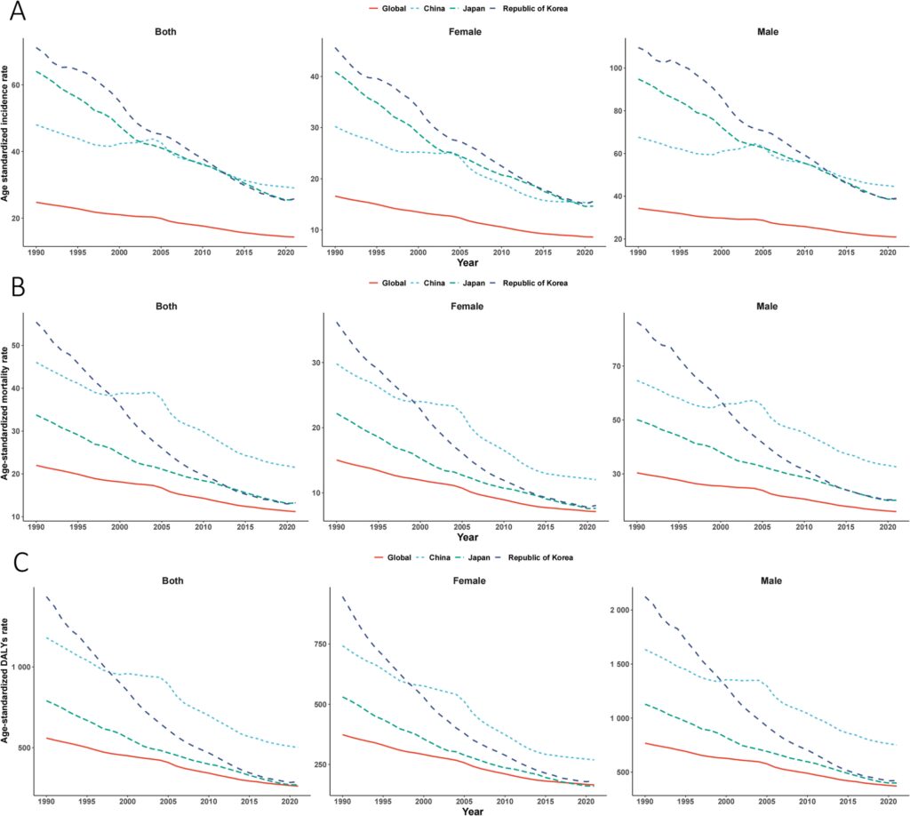 일본과 한국은 더 큰 개선을 보였으며, 특히 한국은 가장 빠른 감소세를 기록하였다. 한국의 ASIR은 1990년 71.18명에서 2021년 25.76명으로 감소하였으며 EAPC는 -3.54로 나타났다.