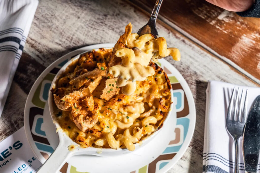 부렐의 매카로니와 치즈가 우아한 느낌이라면, 셰프 루카스 맥키니의 버전은 남부의 매력을 한껏 담아낸다. 미시시피 빌록시 출신의 맥키니는 조셉에서 제공하는 이 요리에 소울풀한 감각을 입힌다. 그릇에 담긴 부풀어 오른 매카로니와 치즈가 테이블에 올라오면, 단순한 사이드가 아닌 바삭한 프라이드 치킨 스킨과 달콤한 열기를 가미한 핫 허니로 장식된 쇼스탑에 가깝다.